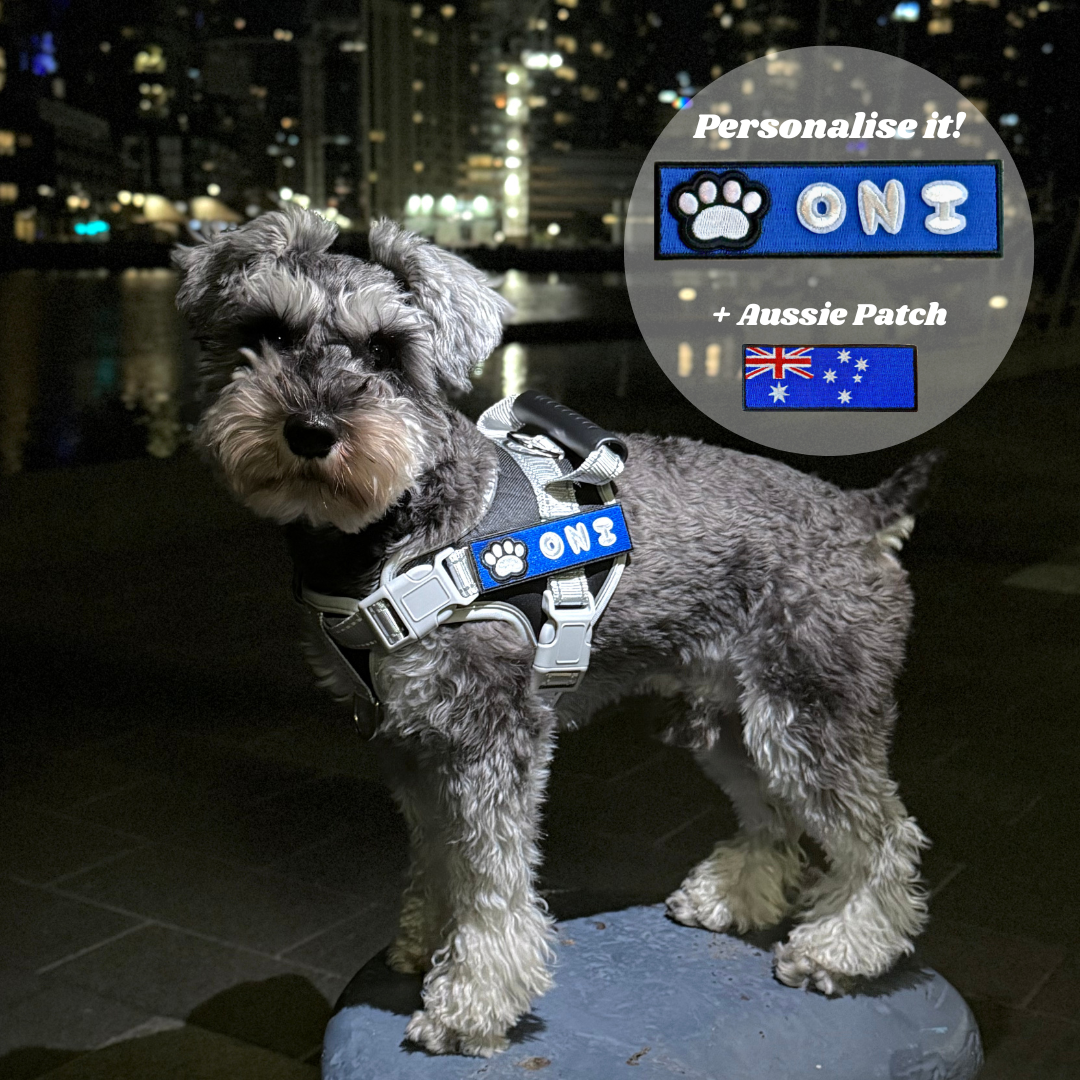 Harness, leash, two patches - personalised & Aussie flag, and free Australia-wide shipping - by Humble Paw.